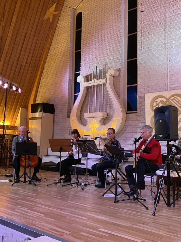46 glada medlemmar mötte upp för en kväll med mingel, god mat från Eva och Carinas kök, lite hjärngympa och till sist underhållning av gruppen Träsmak, som gav oss prov på en blandad och mycket uppskattad repertoar.